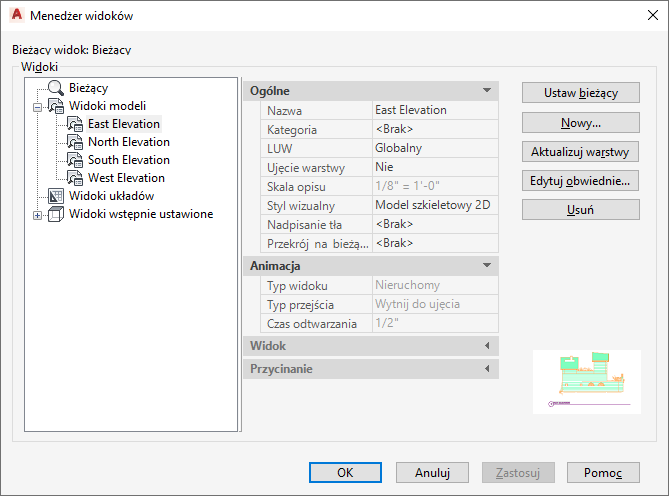 W Menedżerze widoków utworzony widok obszaru modelu jest wyświetlany w polu Widoki.