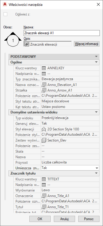 Typ opisu, jego wygląd i inne właściwości charakterystyczne są określane na podstawie edytowanych przez użytkownika wartości arkusza Właściwości narzędzia, który jest dostępny w menu kontekstowym określonego narzędzia.