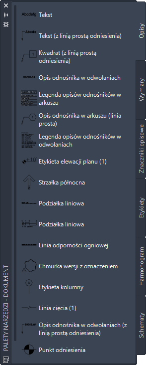 Narzędzi opisów używa się do tworzenia obiektów opisów odpowiadających określonym skalom opisu. Narzędzie opisu to personalizowane narzędzie programu zestaw narzędzi AutoCAD Architecture 2027 umożliwiające dodawanie następujących typów opisów do rysunków: