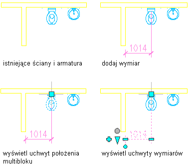 Do wymiarowania można wybrać punkt bazowy obiektu albo każdy z jego punktów OSNAP. W każdym punkcie można dodatkowo zdefiniować odsunięcie od punktu wskazanego do punktu wymiaru, dzięki czemu można wymiarować każdy punkt w obiekcie.