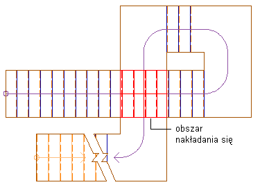 Użyj tej procedury, aby utworzyć schody nakładające się i tak ustawić właściwości wyświetlania, aby poprawnie wyświetlać miejsce nakładania się schodów. W tym przykładzie zostaną wyświetlone wszystkie komponenty schodów powyżej sekcji nakładania się zaznaczonej na czerwono.