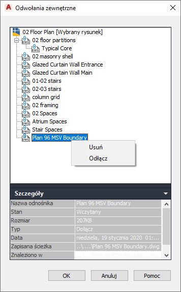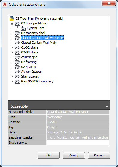 Uwaga: Odnośniki zewnętrzne można również wyświetlić, otwierając konstrukcję w obszarze rysunku programu zestaw narzędzi AutoCAD Architecture 2027 i używając Menedżera odnośników zewnętrznych programu AutoCAD.