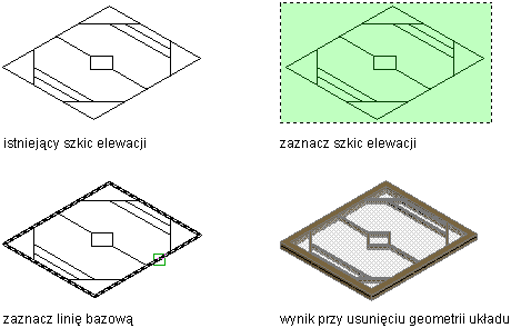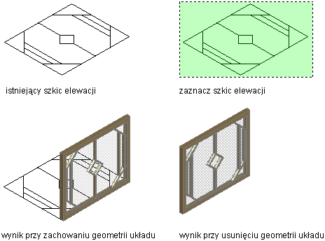 Wskazówka: Jeśli szkic zostanie narysowany w płaszczyźnie XY (w rzucie) oraz zostanie zaakceptowana domyślna linia bazowa, powstały zestaw drzwi/okien będzie widoczny w rzucie o kierunku wzdłuż osi Z.