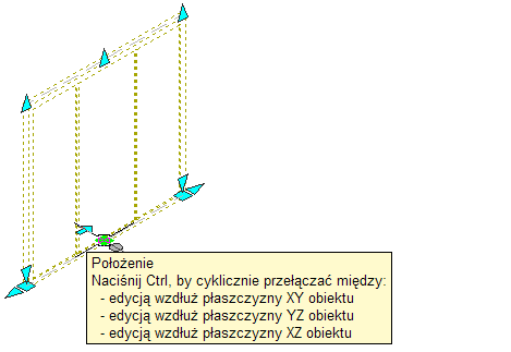 W widoku modelu uchwyt położenia ma trzy możliwe tryby edycji: Edytuj wzdłuż płaszczyzny XY obiektu, Edytuj wzdłuż płaszczyzny YZ obiektu i Edytuj wzdłuż płaszczyzny XZ obiektu. Naciskaj klawisz Ctrl, aby przejść do żądanego trybu. Trybem domyślnym jest edycja wzdłuż płaszczyzny XY. W widoku planarnym uchwyt położenia może się przemieszczać tylko w jednej płaszczyźnie.