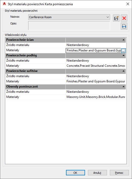 Aby zdefiniować materiał dla stylów materiałów powierzchni i obliczanych ilości dla pomieszczeń