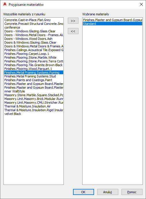Umożliwia wyświetlenie listy wszystkich materiałów zdefiniowanych w programie AutoCAD, które są dostępne na rysunku.