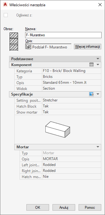 Wygląd arkusza roboczego Właściwości narzędzia zmienia się w zależności od typu komponentu i bieżącej konfiguracji ustawień właściwości. Poniższe rysunki przedstawiają dwie konfiguracje arkusza roboczego Właściwości narzędzia dla narzędzia 04 — Mury, które jest zamieszczone w przykładowej palecie narzędzi podstawowych. Narzędzie jest tak ustawione, aby w obu przypadkach dodawać cegłę ze standardową spoiną 3/8", jednak w przypadku pierwszej konfiguracji właściwość widoku ustawiona została na Przekrój, natomiast w drugim przypadku ustawiono Elewacja (Wzór). W przypadku komponentów detali, które mogą być ustawione w różny sposób w różnych widokach, ustawienie widoku określa procedurę dla poszczególnych rysunków stosowaną do wstawiania obrazu na rysunku. Należy pamiętać, że różne ustawienia widoku sprawiają, że na arkuszu roboczym kierunek ustawienia rysunków jest różny. Należy również pamiętać, że specyfikacje określone dla muru nie mają zastosowania w przypadku ustawienia Elewacja (Wzór) i nie są wyświetlane dla tej konfiguracji. Właściwości wyświetlane dla opcji Specyfikacje mogą również zmieniać się w zależności od innych ustawień. Na przykład jeżeli dla właściwości pokazywania zaprawy wybrano Nie przy ustawieniu Przekrój dla opcji Widok, nie będą wyświetlane inne właściwości muru. W przypadku niektórych komponentów detali specyfikacje nie mają zastosowania i nagłówek nie jest wyświetlany.