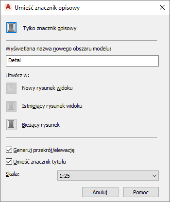 Procedura ta umożliwia umieszczenie znacznika opisowego tworzącego szczegół w bieżącym rysunku widoku.