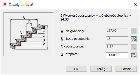 • Gdy Długość liniowa jest obliczana automatycznie , wartość zostanie obliczona na podstawie wymiarów stopnia i liczby podstopnic.