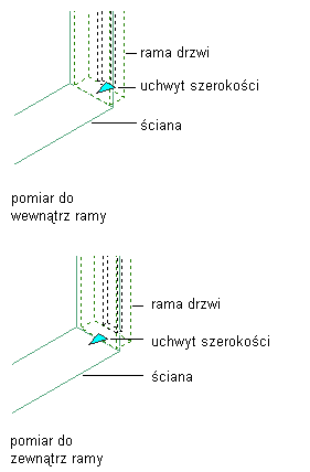 | Pomiar do | Określa, czy szerokość i wysokość drzwi mierzona jest na zewnątrz, czy wewnątrz ramy drzwi. W przypadku pomiaru drzwi na zewnątrz ramy, ich wielkość pomniejszona zostaje o wymiar ramy. Ilustracja![]() |