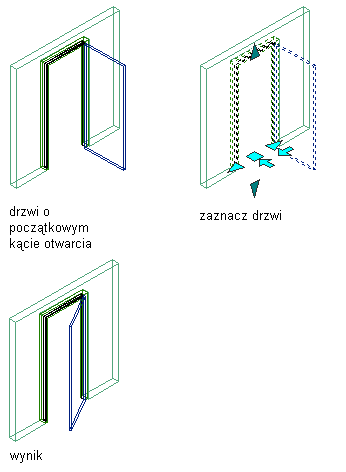 | Kąt otwarcia | Opcja ta umożliwia określenie kąta otwarcia, z jakim wyświetlane będą drzwi. Kąt otwarcia i właściwości wyświetlaniaKąt otwarcia można także określić we właściwościach wyświetlania stylu drzwi. Ustawienia w opcjach właściwości nadpisania stylu. Ilustracja![]() |