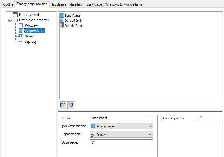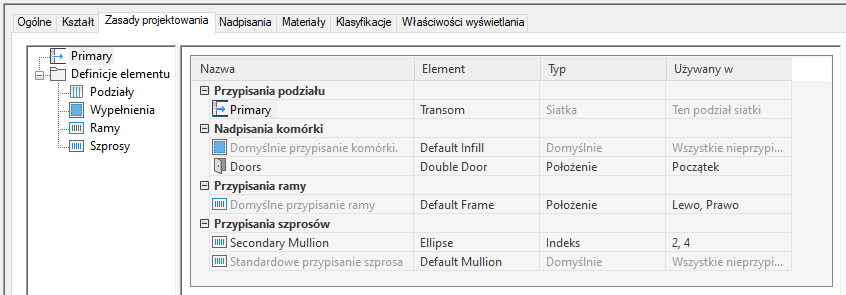 Definicje elementów można modyfikować za pomocą opcji dostępnych na karcie Zasady projektowania znajdującej się w oknie dialogowym właściwości stylu zestawu drzwi/okien. Dostęp do definicji można uzyskać za pośrednictwem listy przypisań i listy definicji: