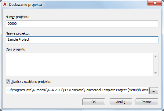Uwaga: Nie można ustawić wszystkich plików pomocniczych i ścieżek bezpośrednio podczas tworzenia nowego projektu; można tylko zdefiniować nazwę, numer, opis i szablon projektu. Pozostałe ustawienia można tylko zdefiniować po utworzeniu projektu. W przypadku tworzenia projektu na podstawie szablonu ustawienia szablonu są używane jako ustawienia wstępne.