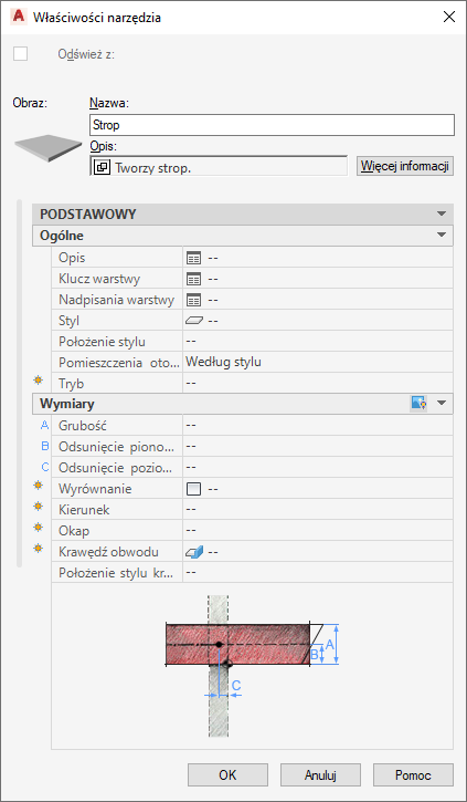 Właściwości narzędzia stropu z domyślnie ustawionym stylem krawędzi.
