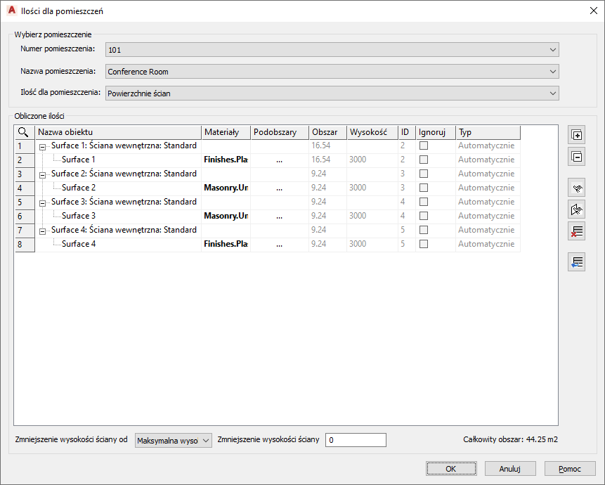 Można na przykład dodać do kategorii „powierzchnie ścian” inną ścianę, która w rzeczywistości nie należy do pomieszczenia (przestrzeni), ale wymagane jest jej obliczenie.
