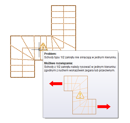 Kiedy program zestaw narzędzi AutoCAD Architecture 2027 wykryje problem ze sposobem rysowania schodów, na schodach w rysunku zostanie wyświetlona ikona etykiety rozwiązania.