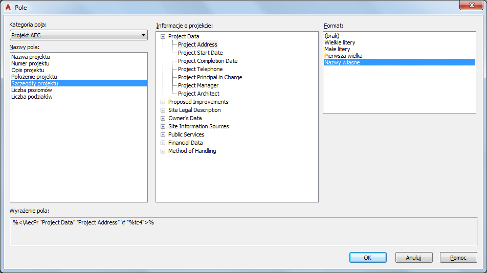 Na przykład, jeśli chcesz wyświetlać szczegóły projektu, jako kategorię pola wybierz Projekt AEC, a następnie jako nazwy pól wybierz Szczegóły projektu.