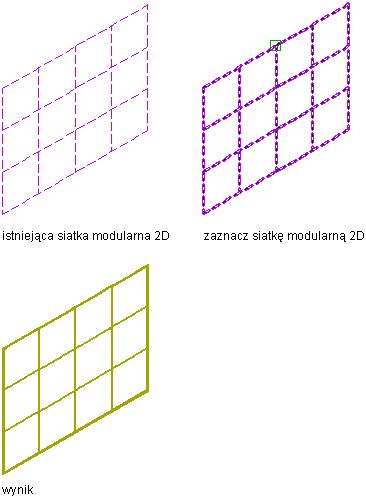 W programie można utworzyć siatkę jednostki ściany kurtynowej opartą na dwuwymiarowej siatce konstrukcyjnej. Jeśli rysunek już zawiera takie siatki, można je z łatwością przekształcić na jednostki ścian kurtynowych. Alternatywnie, jeśli użytkownik sprawnie posługuje się siatkami konstrukcyjnymi, operacja pozwala szybko utworzyć jednostkę ściany kurtynowej, a następnie przećwiczyć stosowanie różnych poleceń obróbki ścian kurtynowych.