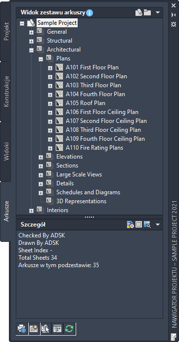 Zestaw arkuszy projektu w Nawigatorze projektu AutoCAD Architecture 2027 Toolset