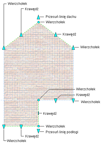 | zmienić kształt linii dachu lub podłogi | wybierz profil i użyj uchwytów Przesuń linię dachu, Przesuń linię podłogi, Wierzchołek i Krawędź w celu dostosowania kształtu. |