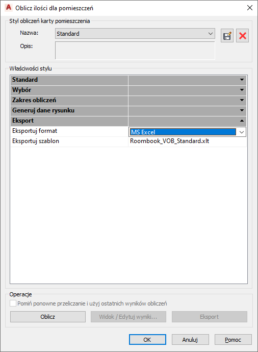 Uruchamia proces eksportowania. Dla każdej kategorii ilości dla pomieszczeń jest generowana osobna karta w arkuszu.