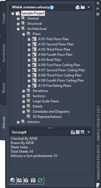 Każdy projekt w programie zestaw narzędzi AutoCAD Architecture 2027 zawiera prosty zestaw arkuszy, który obejmuje wszystkie arkusze projektu.