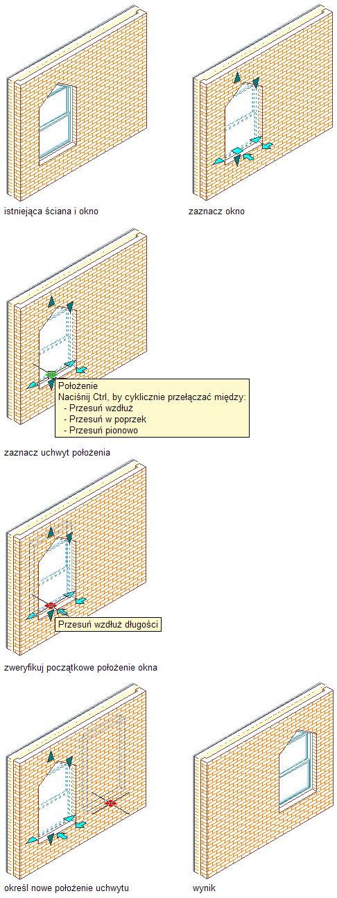 Poniżej opisano procedurę zmiany położenia jednego lub kilku okien wzdłuż ściany przez odsunięcie okien od położenia odniesienia.