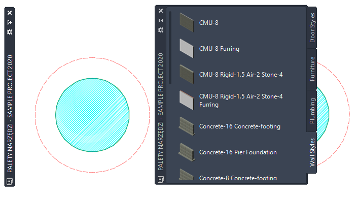 Zestawy palet narzędzi ukryte (lewa strona) i wyświetlone (prawa strona)