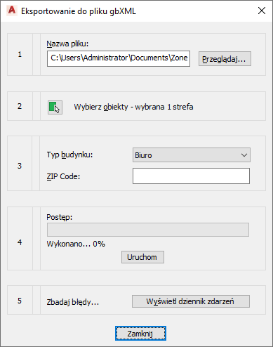 - Wybierz obiekty: okno dialogowe automatycznie wykrywa wszystkie strefy w bieżącym rysunku. Stref z rysunków odnośników nie można wyeksportować, jeśli nie są dołączone do strefy na rysunku bieżącym. Jeśli w oknie dialogowym nie zostaną wykryte wszystkie strefy, kliknij opcję Wybierz obiekty i wybierz żądane strefy.