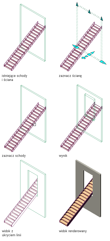 Użyj tej procedury, aby utworzyć obszar przenikania schodów w ścianie. Kiedy zostanie dodany warunek przenikania schodów przez ścianę, zostanie utworzony otwór w ścianie wokół schodów w oparciu o podaną wysokość prześwitu i prześwity z lewej i prawej strony dla schodów prostych i wielospocznikowych oraz wewnętrznych i zewnętrznych schodów spiralnych i zabiegowych.