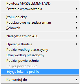 Profile przypisane do obiektów na rysunku mogą być edytowane lokalnie, dzięki czemu użytkownik będzie miał możliwość zmiany kształtu profilu (a tym samym komponentu) na ekranie. Tryb edycji lokalnej to specjalny tryb, w którym istnieje możliwość edycji komponentów obiektów, ale inne opcje są ograniczone. Na przykład w trybie lokalnym nie ma możliwości zapisania i zamknięcia rysunku. Przy upuszczaniu trybu edycji lokalnej użytkownik może podjąć decyzję, czy dokonane zmiany mają być odrzucone, czy ma zostać nadpisana istniejąca definicja profilu, czy też ma być utworzona nowa definicja profilu.