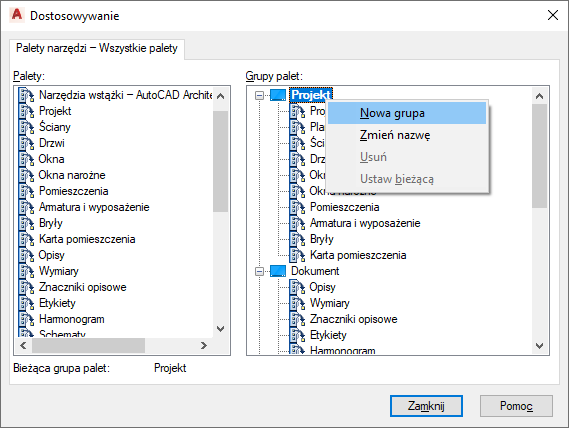 Wskazówka: Okno dialogowe Dostosuj może być bardzo użyteczne podczas dodawania palet do grup palet projektu.
