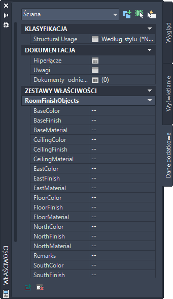 Uwaga: Listą definicji zestawu właściwości na karcie Dane dodatkowe można sterować za pomocą opcji menu rozwijanego Nadpisanie właściwości na karcie Ustawienia obiektu AEC w oknie dialogowym Opcje.