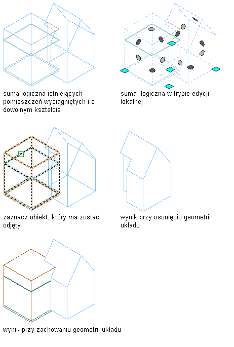 Ta procedura służy do odejmowania pomieszczenia lub innego obiektu AEC od pomieszczenia 3D o dowolnym kształcie. Można odejmować od pomieszczenia dowolny obiekt AEC, który zawiera geometrię 3D.