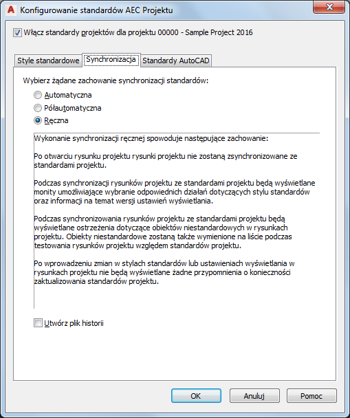 Uwaga: Definiowane ustawienia synchronizacji związane są tylko z synchronizacją standardowych stylów i ustawień wyświetlania AEC w projekcie. Nie wpływają one na synchronizację standardów AutoCAD w projekcie. Ustawienia dostępne w tym oknie dialogowym sterują tylko sposobem synchronizacji rysunków projektu z rysunkami standardów projektowych. Nie określają one sposobu synchronizacji standardów projektowych pomiędzy sobą.