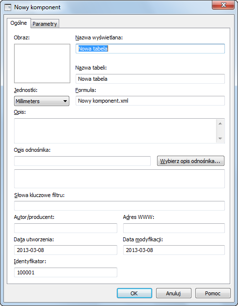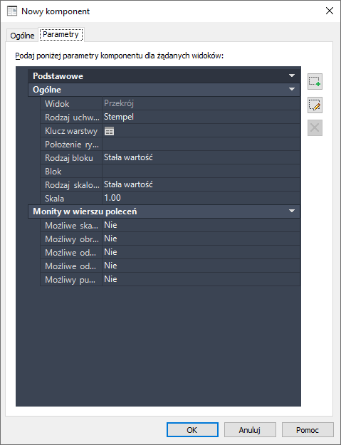 Procedura ta służy do dodawania komponentów do bazy danych komponentów detali i utwórz pustą tabelę rozmiarów, do której można dodawać wiersze reprezentujące rozmiary, w jakich komponent jest dostępny. Po dodaniu komponentu wartości określone na kartach Ogólne i Parametry okna dialogowego Nowy komponent wykorzystane są do tworzenia jednego lub kilku formuł dla komponentu rysunku w różnych widokach. Każda formuła określa typ uchwytu lub procedurę rysowania do umieszczenia komponentu w określonym widoku. Formuła może również zawierać informacje dotyczące warstwy i wzoru kreskowania.