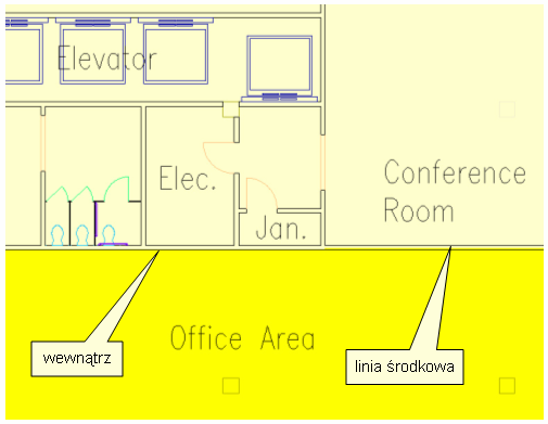 Jeśli istnieje pomieszczenie przyległe inne niż front od ulicy/strona zewnętrzna, obwiednie brutto będą tworzone w linii środkowej ściany.