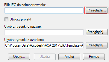 - W oknie dialogowym Importuj plik IFC i utwórz rysunki, w obszarze Plik IFC do zaimportowania kliknij przycisk Przeglądaj.