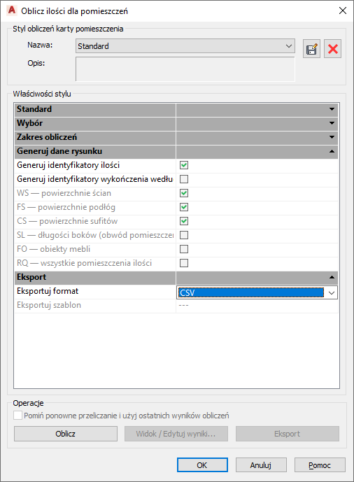 Uruchamia proces eksportowania. Operacja eksportu do formatu CSV powoduje utworzenie jednego pliku dla każdej kategorii ilości dla pomieszczeń. Każdy plik zostaje poprzedzony przedrostkiem zawierającym nazwę rysunku i nazwę typu obliczeń programu Roombook.