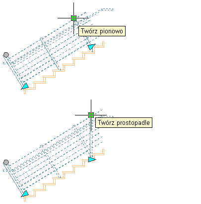 Postępuj zgodnie z tą procedurą, aby określić prostopadłą lub pionową orientacje balustrady w odniesieniu do biegu schodów. Domyślne przy tworzeniu balustrada ma orientację pionową.