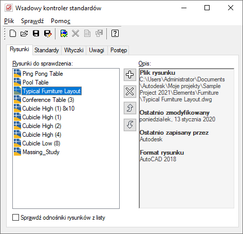 Przed uruchomieniem aplikacji Wsadowy kontroler standardów AutoCAD wymagana jest aktualizacja pliku CHX projektu, aby upewnić się, czy zawiera bieżącą listę plików standardowych AutoCAD oraz plików projektu.