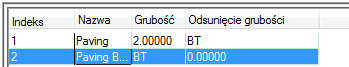 Na przykład, jeśli chcemy utworzyć styl, w którym 2'' komponent chodnika znajduje się ponad bazą chodnika o zmiennej grubości, której dolna krawędź jest taka sama jak linia bazowa stropu, wartości Grubość i Grubość odstępu należy określić następująco: