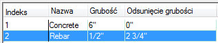 W przypadku bardziej skomplikowanych relacji między położeniami uwzględniających zmienną Grubość bazowa można przygotować formuły obliczające wartości Grubość i Odstęp grubości. Na przykład, jeśli zbrojenie 5'' ma zostać umiejscowione pośrodku betonowej warstwy o stałej grubości 6'', komponenty w stylu stropu można skonfigurować następująco: