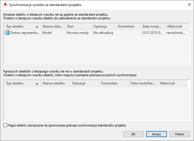 W takiej sytuacji niezestandaryzowany obiekt nie będzie ponownie wyświetlany podczas kolejnych synchronizacji, chyba że zostanie zaznaczona opcja Pokaż obiekty zaznaczone do ignorowania podczas synchronizacji standardów projektu lub zostanie usunięty znacznik Ignoruj z ustawienia stylu lub wyświetlania w Menedżerze stylów lub Menedżerze wyświetlania, patrz opis procedury „Aby wykluczyć style i ustawienia wyświetlania z synchronizacji”.