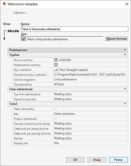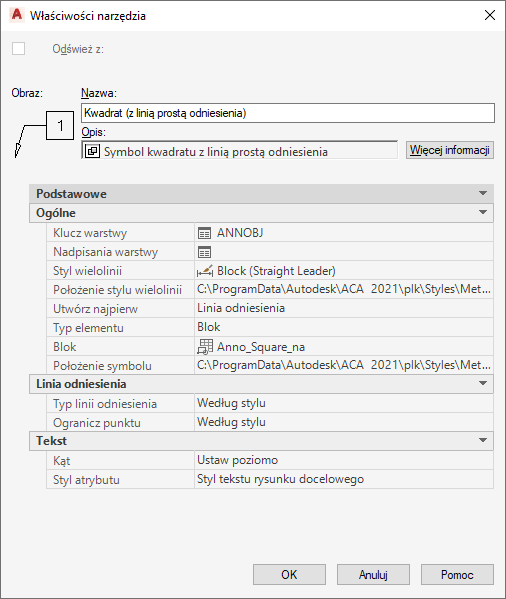 | Styl wielolinii odniesienia | Określa styl wielolinii odniesienia dla opisu. Możliwymi stylami są m.in. Tekstowy, Blokowy i Standardowy. |