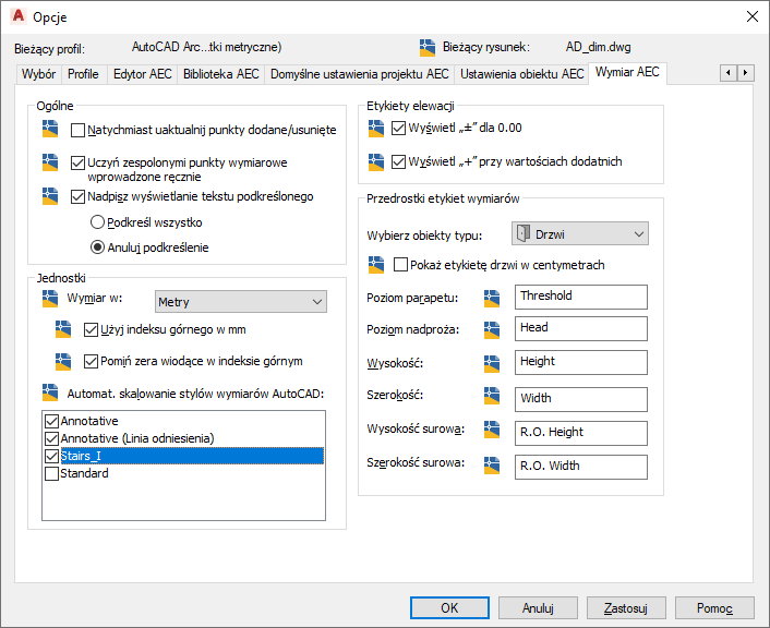 9. W opcji Automat. skalowanie stylów wymiarów AutoCAD wybierz styl wymiarowania AutoCAD, który będzie skalowany po zmianie jednostek rysunku.