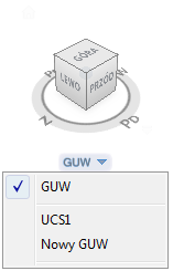 W menu LUW znajdującym się poniżej narzędzia ViewCube jest wyświetlana nazwa bieżącego LUW w modelu. To menu umożliwia przywrócenie jednego z nazwanych układów LUW zapisanych wraz z modelem, przejście na GUW lub zdefiniowanie nowego układu LUW. Opcja GUW z tego menu umożliwia przełączenie układu współrzędnych z bieżącego układu LUW na układ GUW. Opcja Nowy układ LUW umożliwia obrót bieżącego układu LUW o jeden punkt, dwa lub trzy punkty i zdefiniowanie nowego układu LUW. Po kliknięciu opcji Nowy układ LUW zostanie utworzony nowy układ LUW o domyślnej nazwie Bez nazwy. Aby zapisać nowo zdefiniowany układ LUW z nazwą, należy użyć opcji Nazwany w poleceniu LUW.