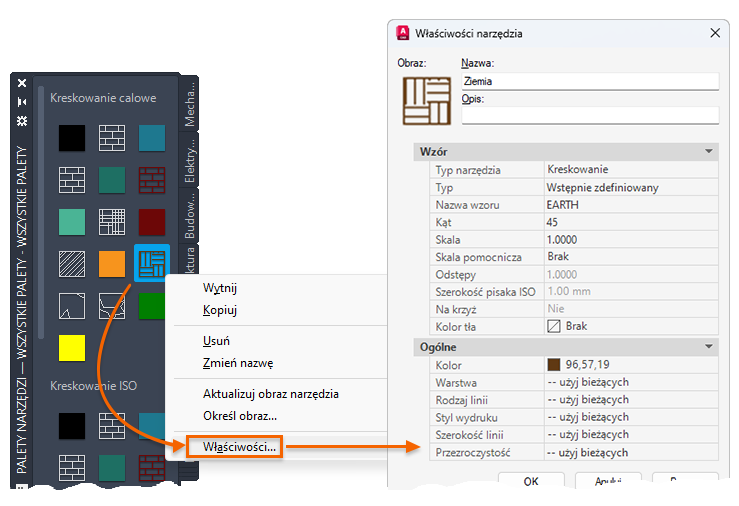 Po dodaniu narzędzia do palety narzędzi można zmienić jego domyślne właściwości. Przykładowo można zmienić skalę wstawienia bloku lub warstwę wzoru kreskowania.