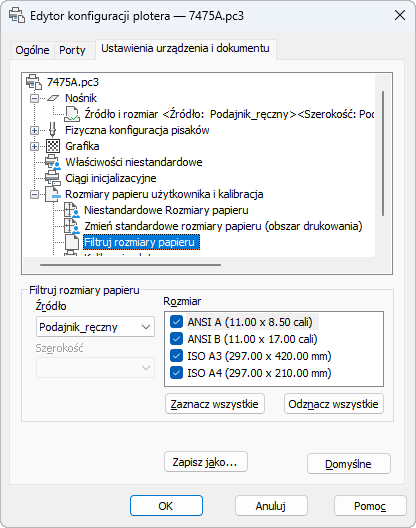 Należy wybrać rozmiary papieru, jakie mają zostać wyświetlone dla danego urządzenia.