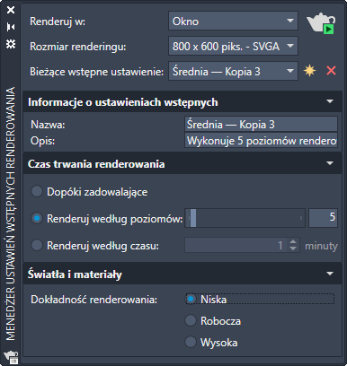 Uwaga: Zmiana ustawień standardowych ustawień wstępnych renderowania powoduje utworzenie nowych niestandardowych ustawień wstępnych renderowania.